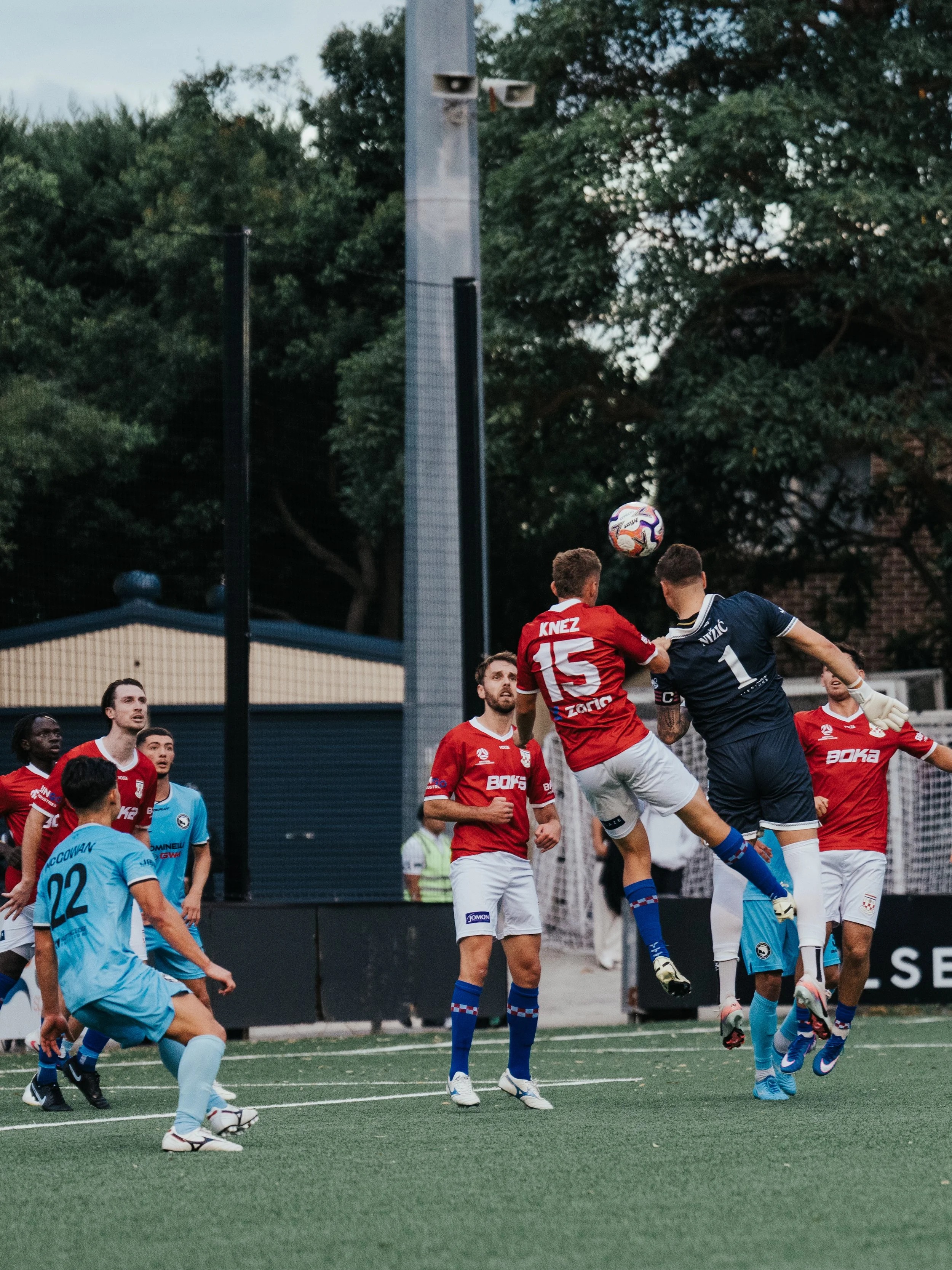Danijel Nizic going up for a corner in the 90th minute